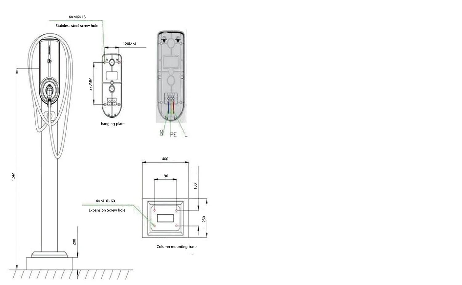 - このデバイスはモジュラー設計原則に従っています。通信モジュールはプラグアンドプレイで、イーサネット/GPRS/3G/4G モジュールと互換性があり、ユーザーは実際のニーズに応じて選択できます。壁掛けと床置きの両方の設置方法に対応できる構造です。壁に取り付けられた充電パイルは、その構造を変更したり、他の付属品を追加したりすることなく、ポールを追加することで床置き設置に変換できます。